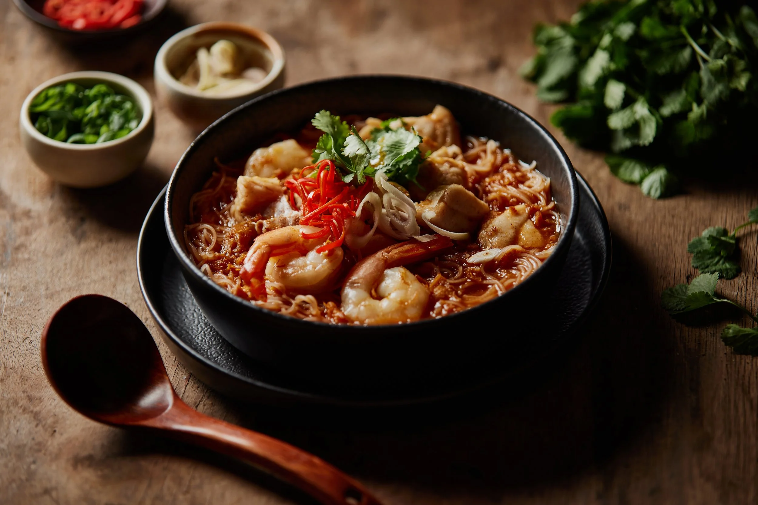 Pre-soak your rice noodles in boiling water for 4-5 minutes, strain and distribute between four large bowls. Pour the freshly cooked soup over the noodles, top with freshly chopped Chilli to taste, then serve.
